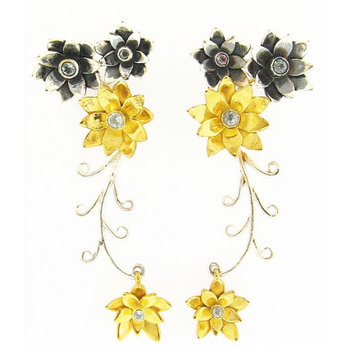14 karat gold-plated silver earrings of flowers and vines accented by aquamarine cabochon.