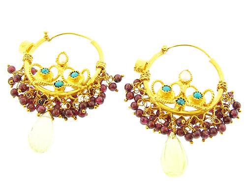 Chandelier earrings of garnet, lemon quartz, turquoise and pearls.