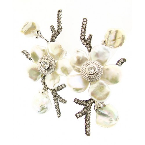 Bold earrings of mother-of-pearl flowers with zirconias.