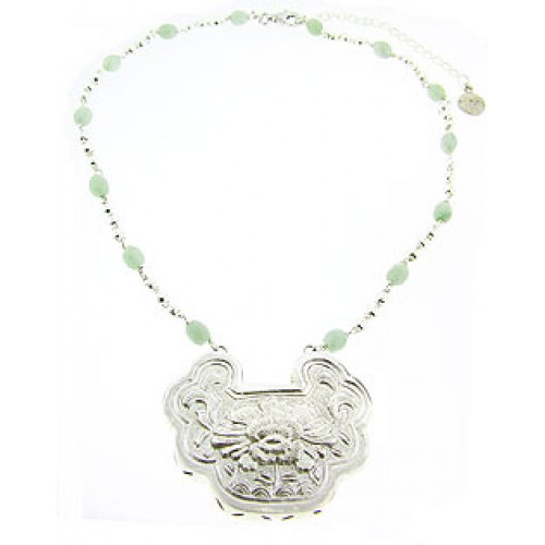Chinese Vintage style silver carved lock pendant of peony flower on silver and jadeite necklace.