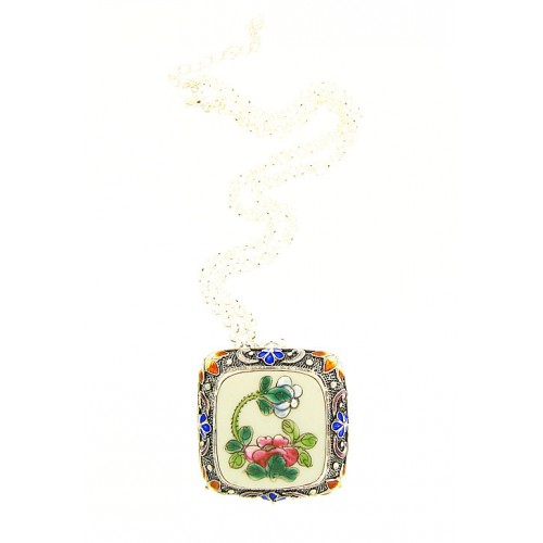Collectible Chinese Antique old porcelain pendant/brooch with enamel frame on silver chain