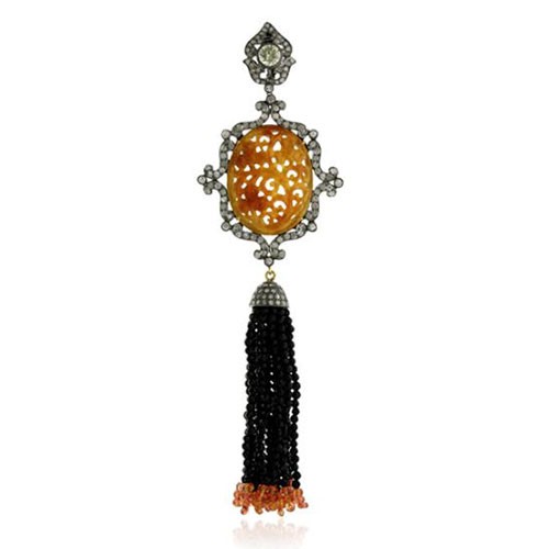 Honey Jade carved pendant with onyx beaded tassels and diamonds.