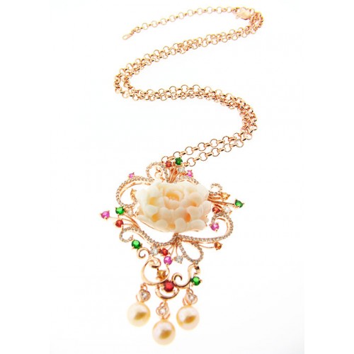 An explosion of colours! Coral peony pendant with sapphires, tsavorites and pearls.