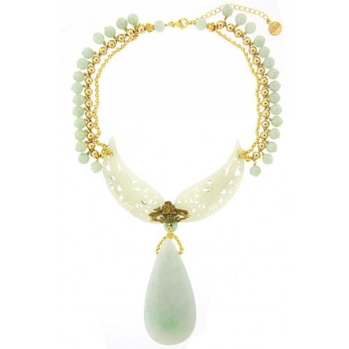 Hetian white jade with apple green jade briolette pendant on necklace of jade and gold chains.