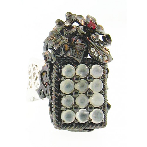 Vintage-style ring of Grade A Burmese icy jade, zirconias and garnet. Flower and leaves accents.