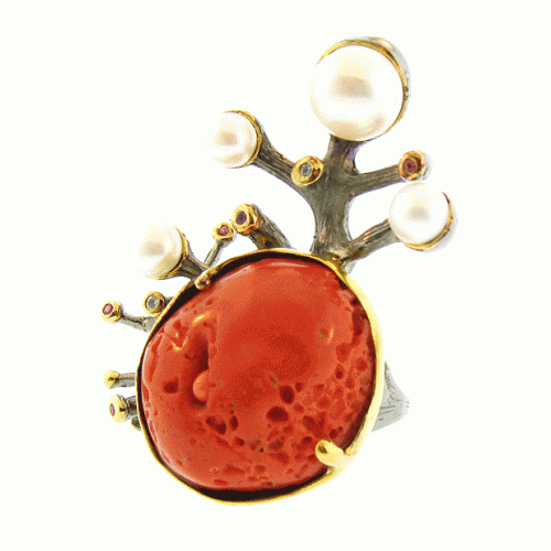 Red Coral statement ring with pearls and semi-precious stones.
