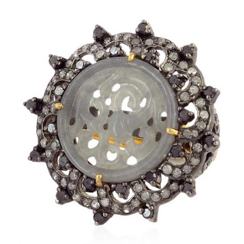 Jade carved ring with Black spinels and diamonds.