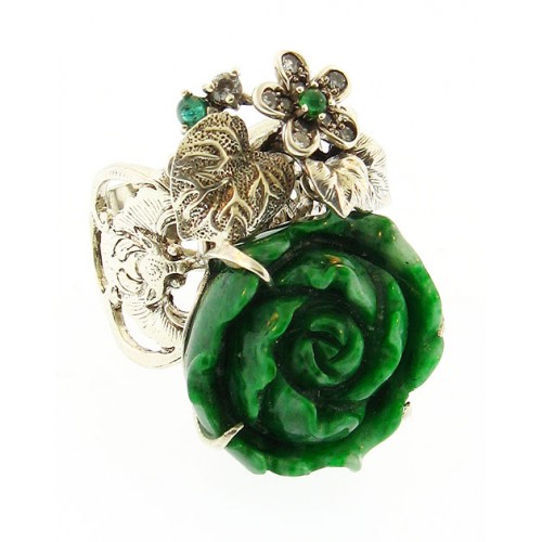 Jade carved peony ring with emeralds and zironias on decorative silver ring band.